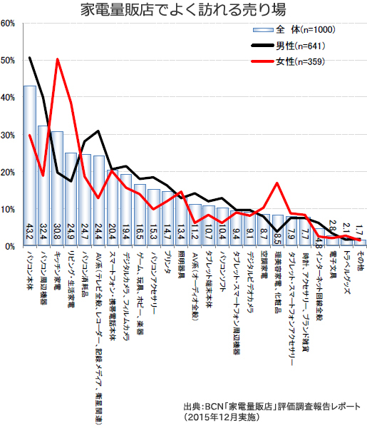 2015年12月にBCNが実施した、家電量販店に1か月に1回以上訪れる1000人を対象にしたインターネットでのアンケート調査によると、「家電量販店でよく訪れる売り場」には男女差があり、男性はPC本体・PC周辺機器、女性は、リビング・生活家電、キッチン家電の比率が突出して高い。女性は男性に比べ、理美容家電・化粧品の比率が高めだ。女性は、自分へのご褒美として「食」や「美容」に関心をもつ傾向が強いことがうかがえる。