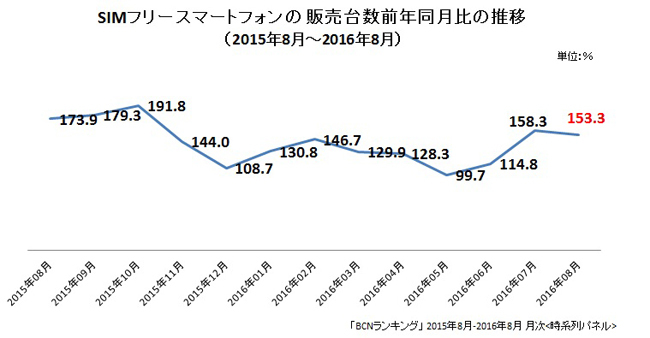 「サービスの多様化」の最たる例が、SIMフリースマートフォン(スマホ)だ。16年8月の販売台数前年比は153.3%で、急速に支持層を拡大している。政府がMVNO各社の市場参入を推進していることもあり、今後も継続的な成長が予想される。microSDカードの販売台数前年比も123.0%と好調で、SIMフリー市場の成長を追い風に存在感を高めている。