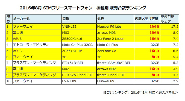 SIMフリーを選択するユーザーは、格安プランに合わせて、手頃な価格帯のモデルを選ぶことが多く、内蔵ストレージ容量は少なくなりがちだ。SIMフリースマホの8月の売れ筋トップ10をみても、キャリアショップで人気の64GBや128GBのモデルではなく、8GBや16GBが主流になっている。