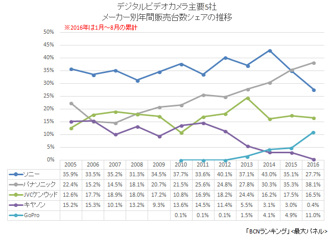 その結果、従来型デジタルビデオカメラのメーカーは、事実上、国内3社だけとなり、上位メーカーの寡占による下位メーカーの撤退、市場規模縮小と、典型的な負のスパイラルから抜け出せない状態にある。スマートフォン、デジタルカメラの動画撮影性能が向上し、専用機をわざわざ買うメリットが薄れたことも響いた。