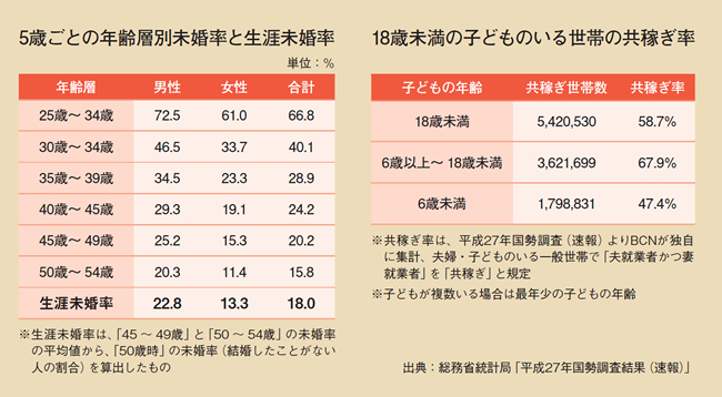 平成27年(2015年)国勢調査(速報)によると、18歳未満の子どものいる世帯の割合は、学生・社会人や高齢者などのひとり暮らしの世帯(32.5%)より少ない22.1%。また、平均初婚年齢を超えた35~39歳の未婚率は、男性34.5%、女性23.3%に達し、「生涯未婚率」と呼ばれる50歳の未婚割合も過去最高を更新した。若年層の一部には「結婚や子どもは贅沢品」という考えが広まり、少子化・未婚化の流れは止まる気配はない。今後、ますます子どもの数、子どものいる世帯の数は減少する。ターゲットを見直さない限り、小さな市場を3社で競い合うことになりそうだ。