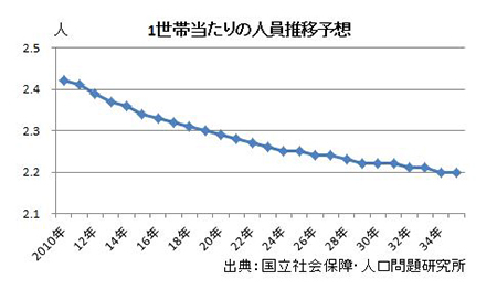 国立社会保障・人口問題研究所が発表した2013年1月推計の「日本の世帯数の将来推計(全国推計)」では、1世帯当たりの人員が年々減少していることがわかる。10年には2.42人だったのが、35年には2.2人に減少すると予想されている。