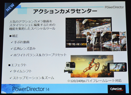 9月15日には下半期の主軸となるであろう「PowerDirector」シリーズの新バージョン「PowerDirector 14」を発表した。最大の注目機能は、人気を集めているアクションカムで撮影した映像の編集に特化した「アクションカムセンター」だ。