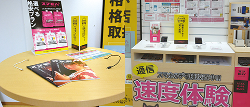 店舗展開をする理由ともなったユーザーの通信品質に対する不安を払拭するため、店内には速度体験コーナーを設置。iPhone とAndroid スマホの実機を置き、実際にインターネットに接続できるようにしている。通信速度は時間帯によっても変わってくる。速度の数値を見せるよりも体感してもらった方が、納得してもらえるという。売り場づくり2