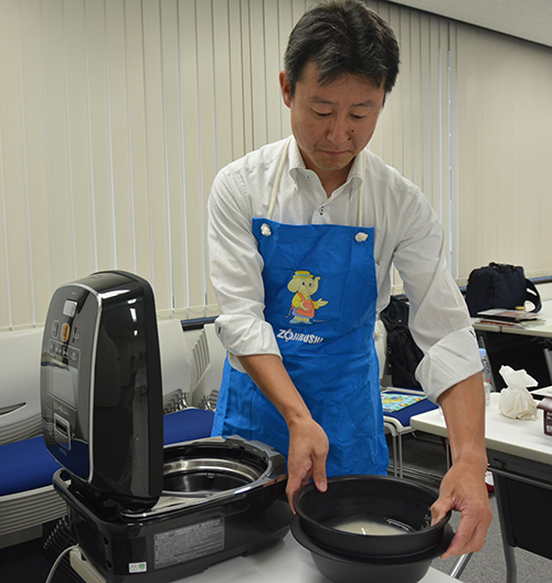 炊き比べの準備をする炊飯器メーカーの担当者