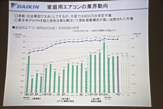 ダイキン工業は10月4日に開催した新製品発表会で、家庭用エアコンの業界動向について「内閣府消費者動向調査によると、エアコンの普及率は90%を超え、保有台数も横ばいが続く成熟された市場」と分析した。