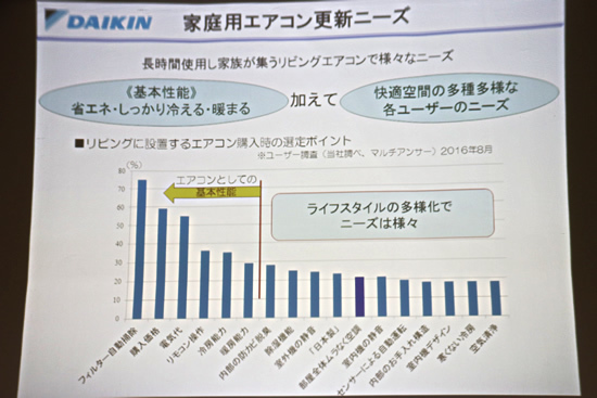 ダイキンの調査によると、リビングエアコンを選ぶ基準は、「フィルター自動掃除」が70%でトップ。次いで、価格、電気代、操作、冷暖房など、上位は、エアコンとしての基本性能に関するものが占める。7位以下には、除湿機能や室内機デザインなど付加価値に関するものが並び、ニーズの多様化がうかがえる。新製品の「うるさら7(Rシリーズ)」の狙いも、ライフスタイルの違いにあわせた、多様なニーズを取り込む点にある。