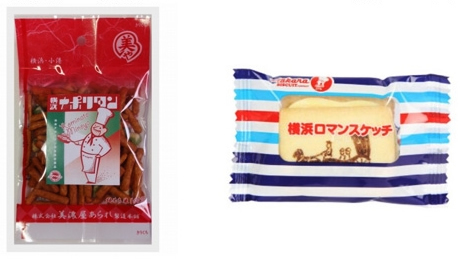 来店者にプレゼントする「美濃屋あられ横浜ナポリタン」(左)と「横浜ロマンスケッチ」