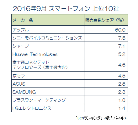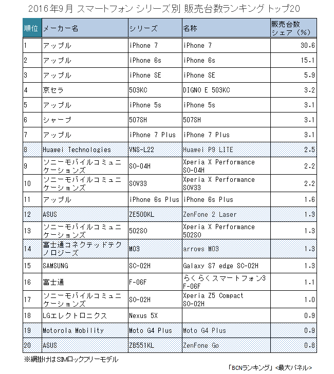 スマートフォン全体の販売台数に占めるSIMフリースマホの割合は、iPhoneの新モデルが発売された影響で、今年9月は14.2%にやや低下したが、8月は過去最高の18.9%を記録した。今年9月のスマホ全体のシリーズ別ランキング1位は「iPhone 7」でシェアは30.6%。SIMフリースマホでは「Huawei P9 LITE」の8位が最上位だった。