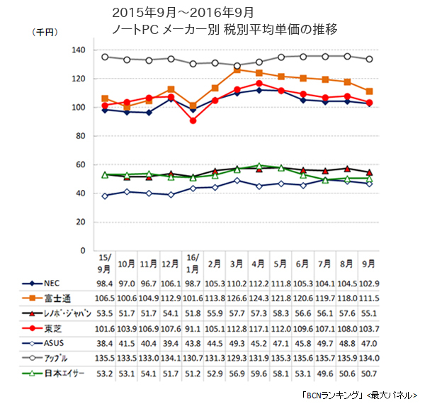 直近の9月のノートPCの税別平均単価は、国内勢の富士通が11万1500円、東芝が10万3700円、NECが10万2900円だった。対して、海外勢のレノボが5万5100円、日本エイサーが5万700円、ASUSが4万7000円だった。