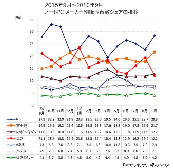 直近1年(2015年9月~16年9月)のノートPC上位7社の販売台数シェアの推移をみると、16年1月や4月、8月など、富士通と東芝の順位が入れ替わるなどの攻防はあるものの、基本的に国内勢3社の上位占有は変わらない。ただし、9月はレノボ・ジャパン(12.7%)が東芝(12.2%)を上回って3位に浮上する変化があった。