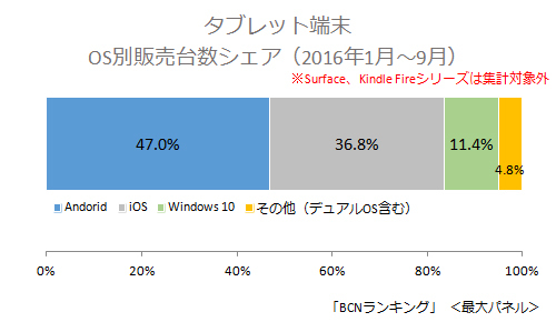 家電量販店の実売データを集計した「BCNランキング」によると、2016年1月~9月の累計で、タブレット端末全体に占めるWindows 10搭載タブレットの販売台数シェアは11.4%と約1割。Androidタブレットが5割弱を占め、iPadが4割弱を占める、という構造だ。しかしここには、Surfaceシリーズの実績は含まれていない。売り上げが公表されていないためだ。販売数は推定するしかないが、少なくとも20%は超えているだろう。AndroidタブレットやiPadと拮抗している可能性もある。