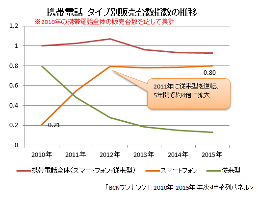 家電量販店の実売データを集計した「BCNランキング」によると、2011年、折りたたみ型を中心とした従来型携帯電話(フィーチャーフォン)と、タッチパネルを採用し、PCと同様、いつでもどこでもインターネットにアクセスできるスマートフォンの販売台数が初めて逆転した。