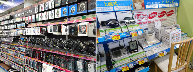 2店舗とも、総合家電専門店として、パソコンやプリンタなどのPC・周辺機器、テレビ・レコーダーなどのAV機器、冷蔵庫・洗濯機・エアコンなどの生活家電、電池・管球・プリンタインクなどの最寄品を取り扱う。実際に体験・体感できるコーナーを設け、例えば、アクセサリコーナーでは、ヘッドホンでハイレゾ音源を試聴できるようにする。