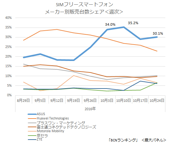 家電量販店の実売データを集計した「BCNランキング」の週次データで、SIMフリースマートフォンのメーカー別販売台数シェアの動きをみると、「ZenFone 3(ZE520KL)」の発売日の10月7日を含む、10月第1週(2016年10月3日~9日)からASUSが急上昇。前週に比べ、10ポイント弱アップしてトップに立った。以降、最大シェア35.2%を占め、5週連続で1位を獲得している。
