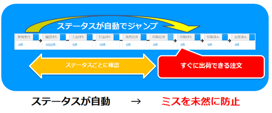 すぐに出荷できる注文はステータスを自動でジャンプするので、作業効率が上がるだけでなく、より早く顧客の手元に商品を届けることができる。