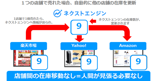 ネクストエンジンなら、受注した時点で各モールの在庫数が自動で更新される。どこかの店で1個売れたら、ネクストエンジンとつながっている各モールの在庫情報が変更される仕組みである。
