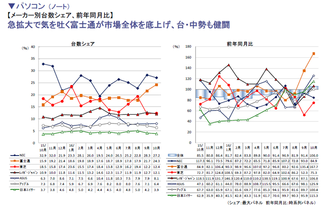 同じく10月は、ノートPCの販売台数は前年同月比106.0%となり、「Windows XP」サポート終了に伴う買替え特需以来、30か月ぶりに前年を上回った。特に、前年同月比167.7%という大幅増を記録した富士通やASUS(125.9%)、日本エイサー(115.3%)といった中・台勢の好調が目立つ。デスクトップPCは、依然として前年割れから抜け出せていない。