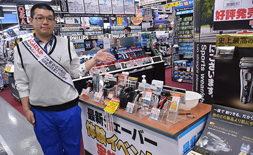 刃の枚数や部品の厚みが下位モデルと異なるので、髭のクセに関係なく、しっかり剃れることを強調しよう。T字カミソリに比べて肌の負担が少ないのも特徴だ。剃り心地を体感してもらえば、フラッグシップモデルへのステップアップも期待できる。