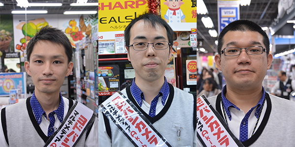 左から、コンシェルジェ第2チーム 今成圭佑担当(冷蔵庫、エアコン、洗濯機)、同 内田邦智担当(オーブンレンジ)、理美容専門チーム プロダクトスペシャリスト 関東嗣朗グループリーダー(電気シェーバー)