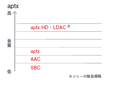 Bluetoothで音を伝送するときに圧縮する方式の一つ。標準的な規格の「SBC(エスビーシー)」に比べて圧縮率が低く、高音質。対応する製品が増え、上位製品との互換性がある「aptx HD(エイチディー)」が登場するなど、発展を続けている。一方、ソニーはBluetoothでハイレゾ相当の音質を再現する「LDAC(エルダック)」という方式を採用するが、ソニー製品以外との互換性はない。販売時には注意したいポイントだ。