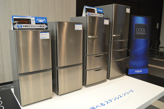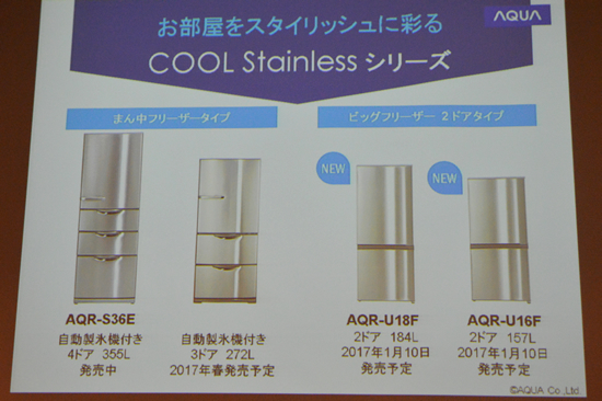 今回発表したのは、ステンレス扉を採用した冷蔵庫「COOL Stainless(クールステンレス)」シリーズの第2弾。すでに発売している4ドア・355Lの「AQR-S36E」に、17年春発売予定の3ドア・272Lモデル(型番未定)、17年1月10日発売の2ドア・184Lモデル「AQR-U18F」、2ドア・157Lモデル「AQR-U16F」の3機種を追加する。価格はいずれもオープン。