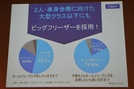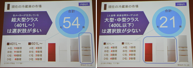 アクアの調査では、16年11月時点の日本市場で、冷蔵庫は401L以上の超大型クラスが54機種あるのに対し、400L以下の中型・大型クラスは21機種にとどまる。2人世帯・単身世帯がファミリー世帯の比率に迫っている現状を踏まえると、中型・大型の冷蔵庫は今後の伸びが大きく期待できる領域だ。