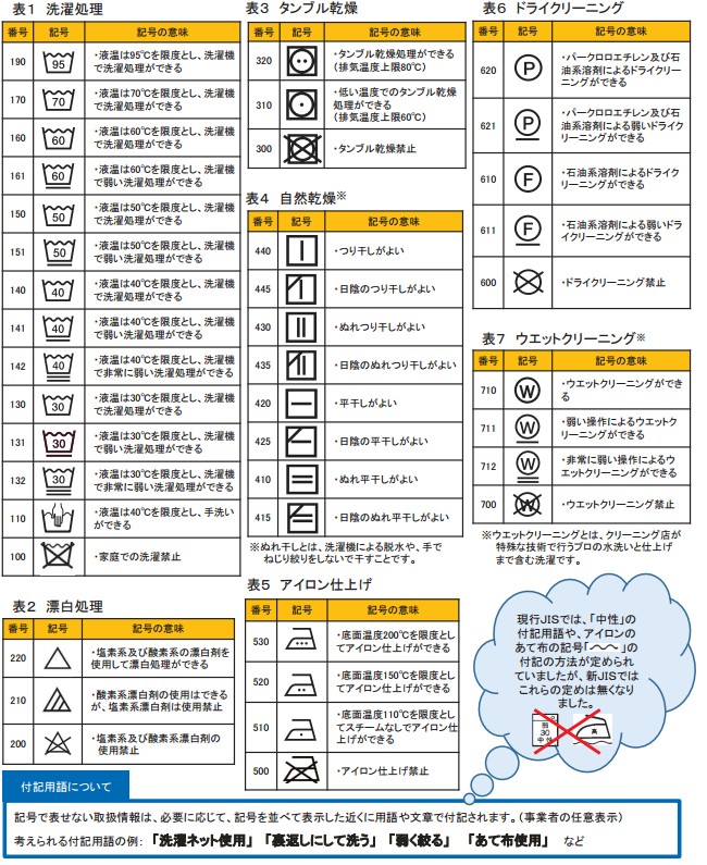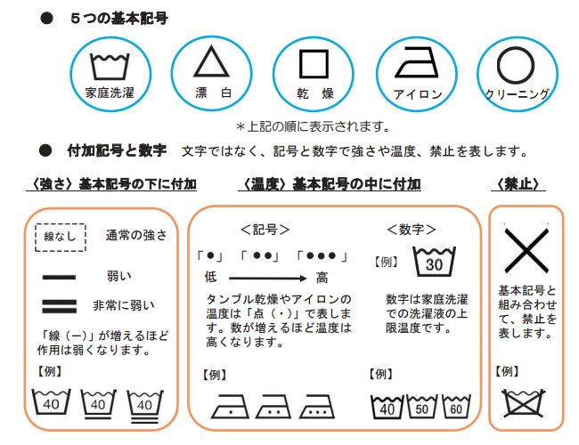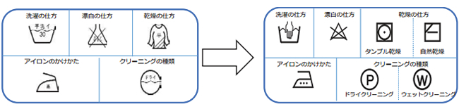 具体的には、「洗濯の仕方」「漂泊の仕方」「乾燥の仕方」「アイロンのかけ方」「クリーニングの種類」などのイラストが変わる。五つの基本記号と付加記号・数字の組み合わせで構成し、国際規格に準拠しているため、従来とは異なり、文字(日本語)は用いられない。ただ、記号だけで伝えられない情報は、付加用語として、「洗濯ネット使用」といったように、簡単な言葉で記号の近くに記載する。