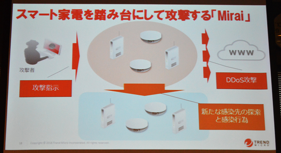 大三川副社長は、直近の動向として「Mirai(ミライ)」という新型ウイルスの事例を紹介。「今年の9月頃から攻撃が頻発している。従来のターゲットであったPCやスマホではなく、Webカメラなどのスマート家電を踏み台にして、ネットワークやサーバーに攻撃するのが特徴。これらの端末は管理コンソールに簡易なパスワード設定をしているケースが多く、恰好の的になっている」と警鐘を鳴らした。