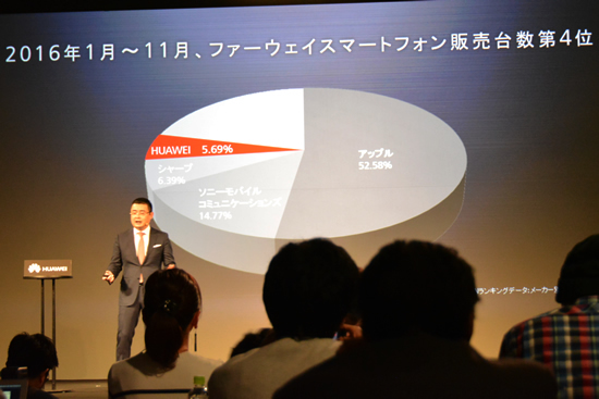 家電量販店の実売データを集計する「BCNランキング」によると、2016年1月~11月の累計で、スマートフォン全体でのファーウェイの販売台数シェアは5.7%。Apple、ソニーモバイルコミュニケーションズ、シャープに続き、4位につける。この上位4社のなかで「SIMフリーをメインにしているのはファーウェイだけ」と呉波プレジデントは強調した。