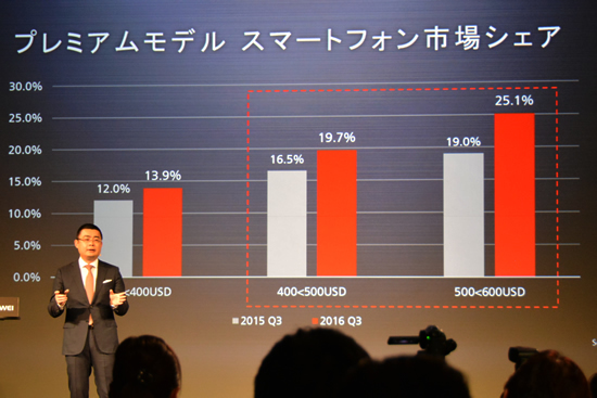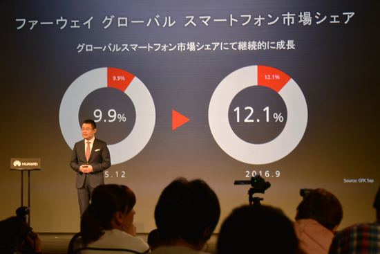 呉波プレジデントは「10月中旬に、2016年のグルーバルでの販売台数は1億台を突破した。1億台への到達は2015年の実績より2か月も早い。また、9月には、スマホのグローバル市場でシェアが12.1%になり、第3位となった。これでアップル社との差が縮まった」と、大きく躍進しているとアピールした。