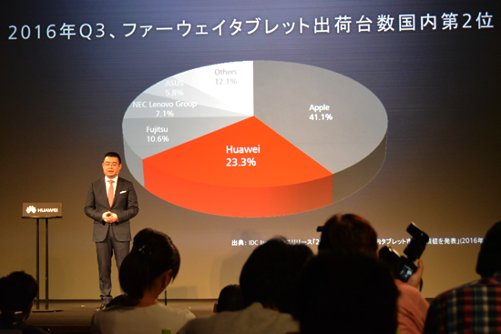 日本市場では、2016年第3四半期、タブレット端末の出荷台数で、Appleの41.1%に次ぐ、23.3%を占め、2位に浮上した。Androidタブレット端末に限れば1位だ。