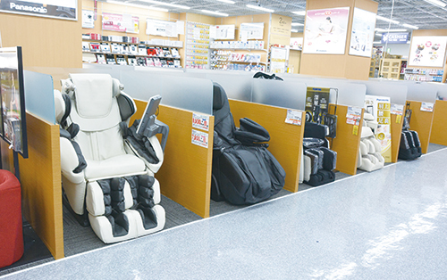 マッサージコーナーでは、体感できる実機を多数用意するだけでなく、一台一台に仕切りを設け、顧客のプライバシーを守り、さらに利用しやすい空間にした。フットマッサージや血圧計も試すことができ、テーブルには雑誌などを配置する。