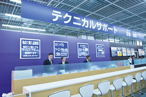 テクニカルサポートでは、PC の購入前の相談、購入時の設置、購入後のトラブルサポートまで対応する。アンサーセンターでは、持ち込まれたPC のトラブルに対応。これまで設置、修理など別々のチームが担当していたが、一括してヤマダ電機のスタッフが対応することで顧客に寄り添った接客、提案を目指す。