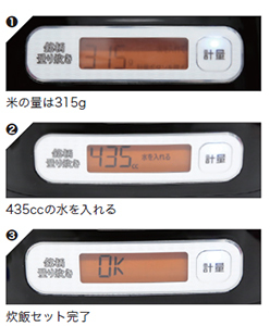 「メニュー」で新米や無洗米などを選択した後、米の「銘柄」を選択。空の内釜をセットして「計量」を押してゼロ設定する。米を投入すると重量が表示。再び「計量」を押すと最適な水量が表示。洗米後、水を投入すると水量表示がカウントダウンし、ゼロになるとセットが完了。
