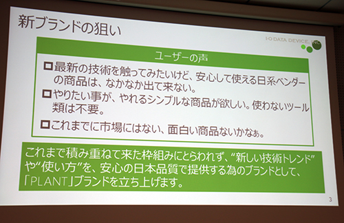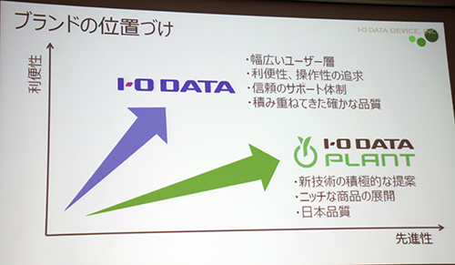 最新技術をいち早く提供するのは、流行に敏感なユーザーやゲームユーザーなどをターゲットに、ハイスペック製品を展開する海外勢が得意とする場合が多い。I・Oデータは、「PLANT」を新たな武器に海外勢に対抗する方針で、ブランド名には「これまで培ったノウハウを土壌に、新しい芽となるような商品をお客様に届けたい」との思いを込めた。