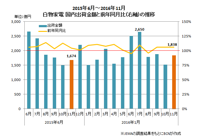 日本電機工業会(JEMA)は12月20日、調理家電・生活家電・理美容関連機器などの白物家電の2016年11月度の国内出荷金額を発表した。それによると、出荷金額は前年同月比109.8%の1838億円で、3か月連続でプラスとなった。