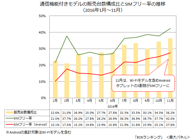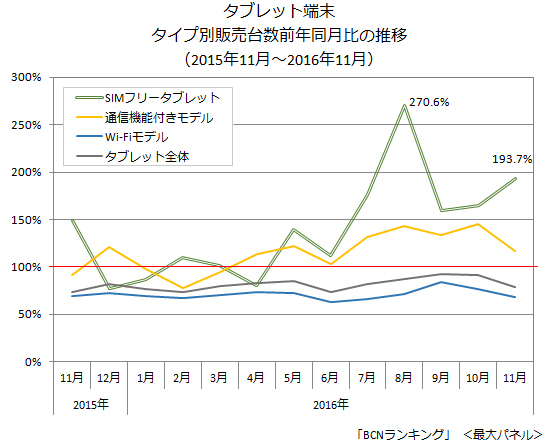 対して、端末単体でデータ通信できる通信機能付きモデルは、前年を大幅に上回る月もあり、Wi-Fiモデルに比べると売れ行きは順調だ。タブレット全体の販売台数に占める割合も3割未満から4割弱へと拡大。特に今年7月以降、好きなキャリアのSIMカードを挿入して使えるSIMフリータブレットが伸びている。7月~11月の前年同月比は159.0~270.6%。以前の販売数が少ないとはいえ、前年実績に比べ、最大3倍弱という驚異的な伸び率を記録した。