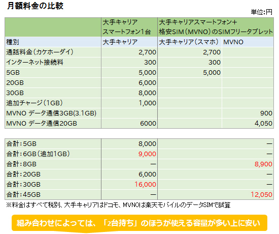 一方、SIMフリータブレットの場合、「格安SIM」と呼ばれるMVNOのデータ通信専用SIMを選べば、通信料金は、月間3GBの場合でおおむね月額1000円程度。大手キャリアのデータ通信サービスの追加チャージは、1GBにつき税別1000円なので、スマホ1台で動画をたくさん見て、足らなくなった場合に追加チャージするより、動画試聴専用のタブレットを用意して、別途、MVNOを契約したほうが利用できるデータ容量が多くなる上、通信料金も安く済む計算だ。