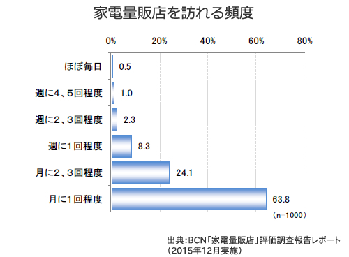 プレミアムフライデーが成功する下地はある。2015年12月にBCNが実施した、家電量販店に1か月に1回以上訪れる1000人を対象にしたインターネットでのアンケート調査によると、家電量販店への訪問頻度は「月に1回程度」が最も多く、「月に2、3回程度」、「週1回程度」と続いた。