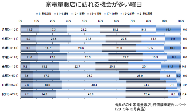 家電量販店に訪れる機会が多い曜日は、日曜(57.9%)、土曜(50.1%)、祝日(27.3%)、金曜(15.4%)、水曜(14.3%)、木曜(11.8%)、火曜(11.1%)、月曜(10.8%)の順で、金曜は、平日の中で比率が高かった。
