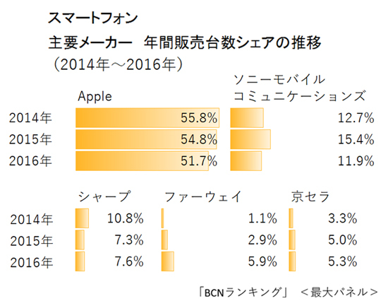 家電量販店の実売データを集計した「BCNランキング」の年間データによると、スマートフォン全体の販売台数に占めるAppleのシェアは、iPhoneの取り扱いキャリアが3社に増えた2年目の14年には55.8%と、6割に迫った。16年も51.7%を占め、依然として2位以下を大きく引き離している。