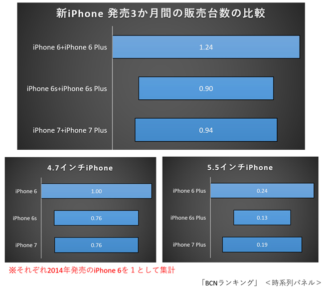 ただ、発売から3か月間の販売台数を比較すると、「iPhone 7」は前機種「iPhone 6s」より若干下回っているものの、「iPhone 7 Plus」は「iPhone 6s Plus」を上回っており、2機種あわせると、前年実績を超えている。
