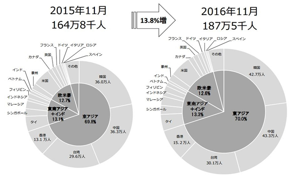 日本政府観光局(JNTO)の推計によると、2016年11月の訪日外客数は、前年同月比113.8%の187万5000人となり、11月としては過去最高を記録した。