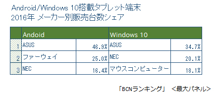 Android/Windowsタブレットとも2016年の年間シェア1位はASUS