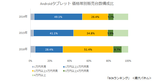2015年と2016年の価格帯別販売台数構成比を比較すると、2016年は「1万円以上2万円未満」のタブレットが縮小し、代わって「2万円以上3万円未満」が拡大。「1万円未満」も微増しているため、平均単価は変わっていないものの、最多価格帯は1万円台から2万円台にシフトした。