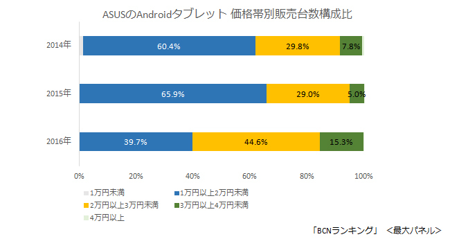 ASUS製品に限ると、さらに変化は顕著で、2015年は29.0%だった「2万以上3万円未満」が44.6%、5.0%だった「3万円以上4万円未満」が15.3%へと拡大し、3万円超のプレミアムタブレットの比率が高まっている。
