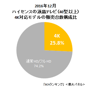 家電量販店の実売データを集計した「BCNランキング」をもとに、ハイセンスの40型以上の液晶テレビの2016年1月の販売台数を1として、直近の16年12月と比較すると、12月は約1.5倍の1.42に達した。4Kテレビの比率は25.8%。ハイセンスの40型以上の大画面テレビのうち、4台に1台は4Kが売れているというわけだ。