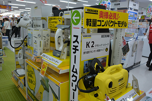 ホームセンターでは、外壁や洗車用など屋外で使う製品が主力だ。顧客層も40代以上の男性が多く「郊外、一軒家」がメインターゲットになる。対して家電量販店は女性客の比率が高く、屋内向け製品の割合が増える。