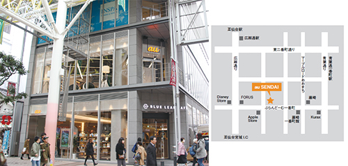 KDDIの直営店として初めてカフェ「BLUE LEAF CAFE」を併設。名前の由来は、「杜の都仙台」を象徴する「青々と茂る木々」から。カフェのみの利用も想定し、au ショップであることを前面には出さず、誰でも入りやすいように工夫している。蔵王の卵を使った「フレンチトースト」など、地元の食材を使ったメニューで地域色も出す。